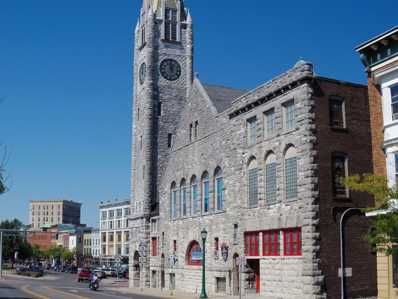 Home to one of Watertown’s best-known landmarks, the clock tower, the First Baptist Church dominates the eastern end of Public Square. Originally built in 1837, it was destroyed by fire 1846 and rebuilt the same year at a cost of $6,000. The church was used until it was torn down in 1891. The present church was built in 1891 using native limestone from outside the city and marble brought in from Gouverneur. The completed building, which cost about $31,000, was dedicated on September 13, 1892.